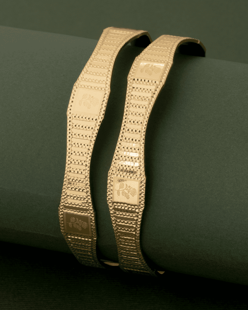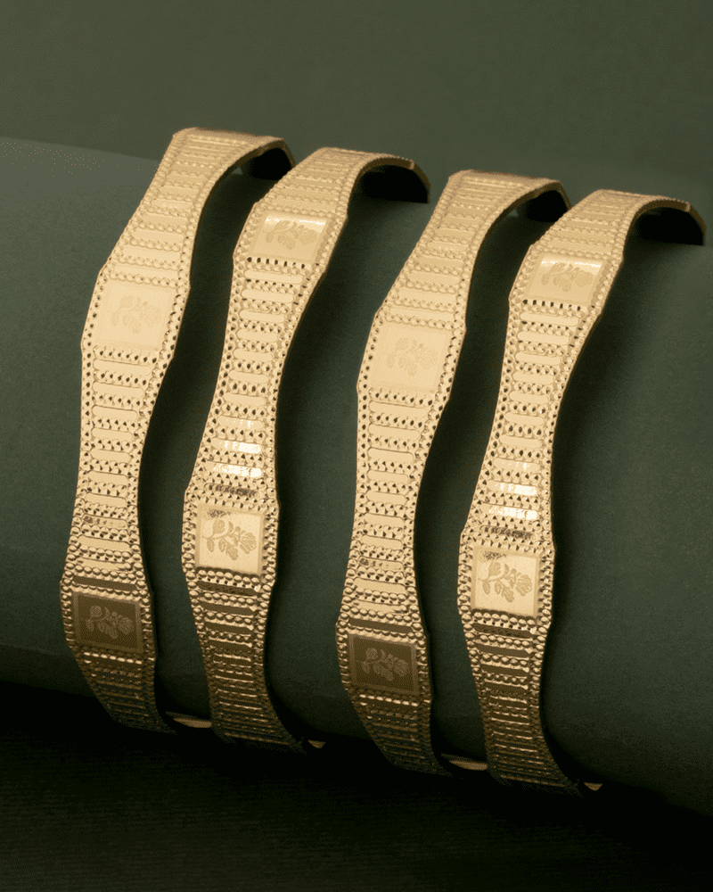 إليكِ بناجر خاتون® الذهبية التي تجمع بين الفخامة والأناقة، حيث تم تصميمها بعناية لتزين معصمك في مناسباتك الخاصة. نقشة الورد الرقيقة تضيف لمسة من الجمال الطبيعي، لتكون هدية مثالية تعبر عن ذوقك الرفيع. توفر لكِ هذه البناجر بريقًا لا مثيل له، لتكتمل إطلالتك بكل تألق.