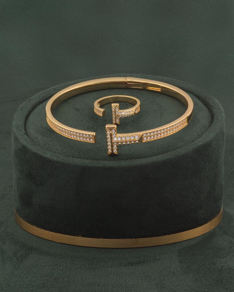 • طقم إسوارة مفتوحة مرصعة بالكامل بالزركون مع خاتم.