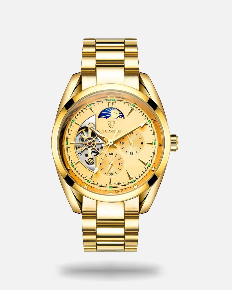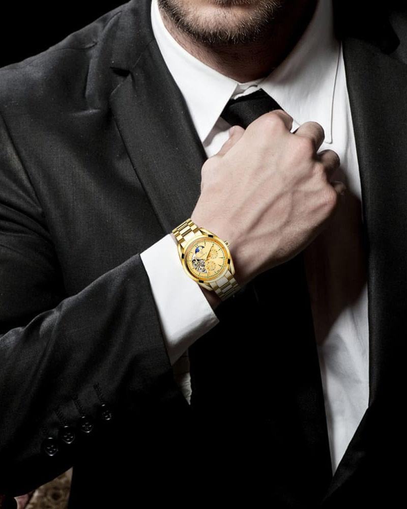 - ساعة تناظرية تتضمن ميزات عديدة مثل التقويم الكامل وغيرها ما يجعلها أساس المجموعة الفاخرة للرجل.