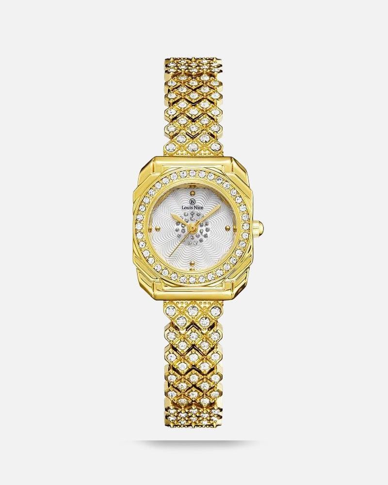 • لمسة ساحرة: تم ترصيع الساعة بفصوص الزركون بحرفية واتقان لتحتفظ ببريقها الساحر