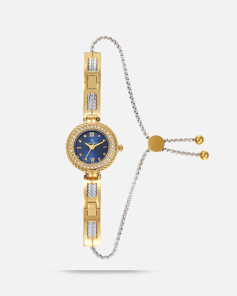 أضيفي لمسة من التميز لإطلالاتك اليومية مع ساعة نسائية بلون ذهبي فضي ومينا أزرق جذاب. تصميم مثالي للمرأة العصرية.