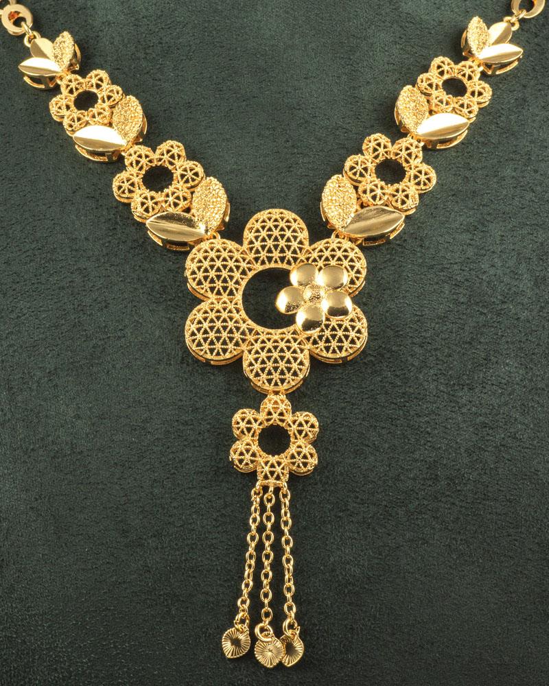 اختاري الفخامة بلمسة عصرية في أهم مناسباتك. طقم مجوهرات بديل الذهب مصمم بنقشة الوردة وبلمعة فاخرة تضاهي الذهب الحقيقي، ليمنحك أناقة تلفت الأنظار في يوم الخطوبة أو أي مناسبة خاصة.