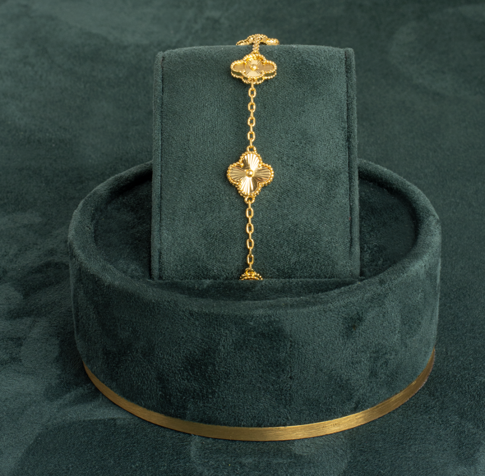 • تصميم عالمي ينبض بالحياة، يجمع بين خاتم يزين بنانها، سوار يلتف حول معصمها كهمسة رقيقة، سلسال يضيء عنقها، وأقراط تزيدها تألقاً.