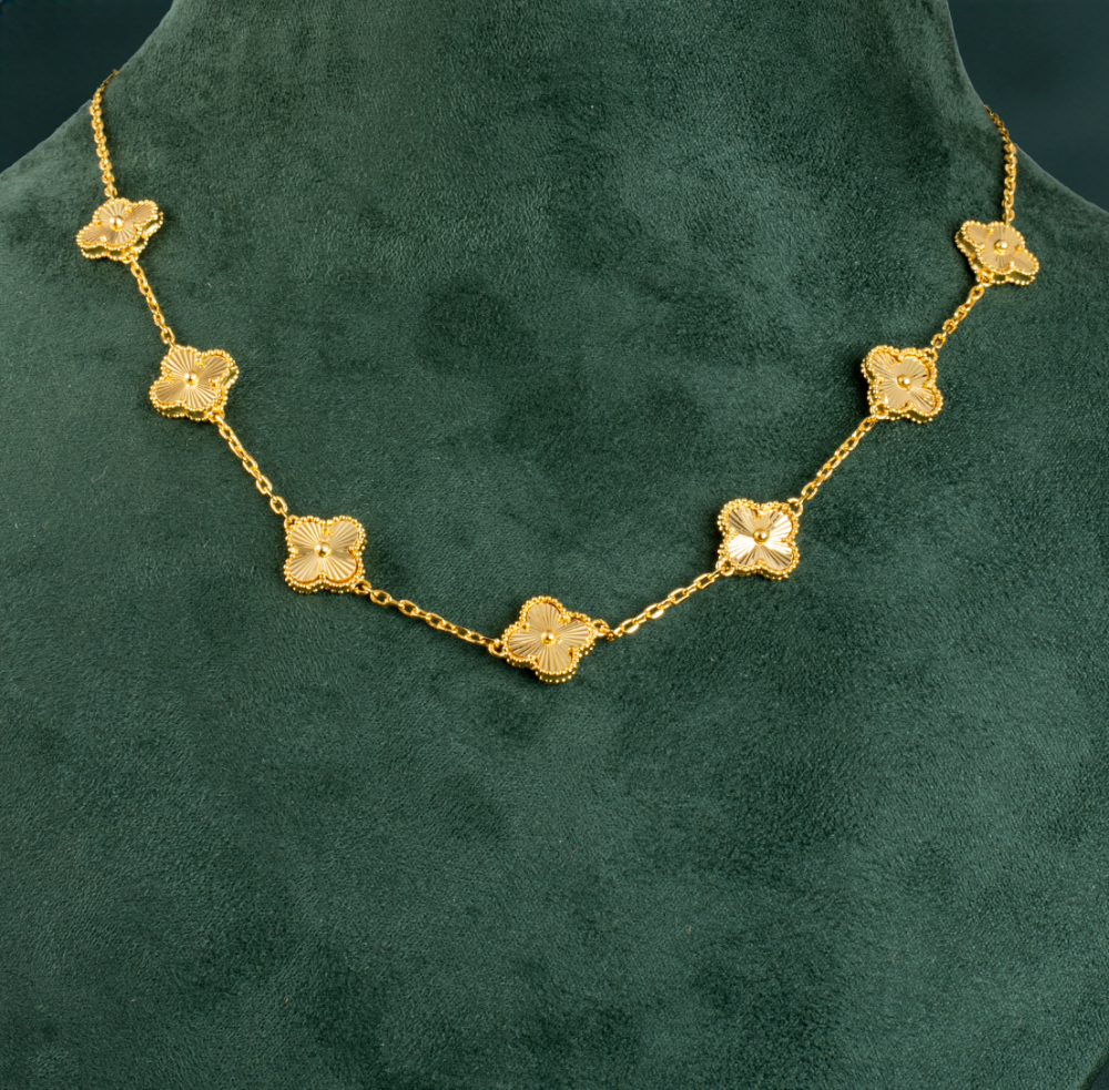 يتميز هذا الطقم بتصميمه الانسيابي، إنه سلسال غاية في الرقة يربط بين مجموعة من الحلقات المطلية باللون الذهبي والزينة بــ أحجار عين النمر، ولأنه تصميم عالمي فهو قطعة تستحق ان تزين اطلالتك الرائعة.
