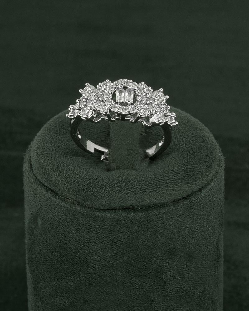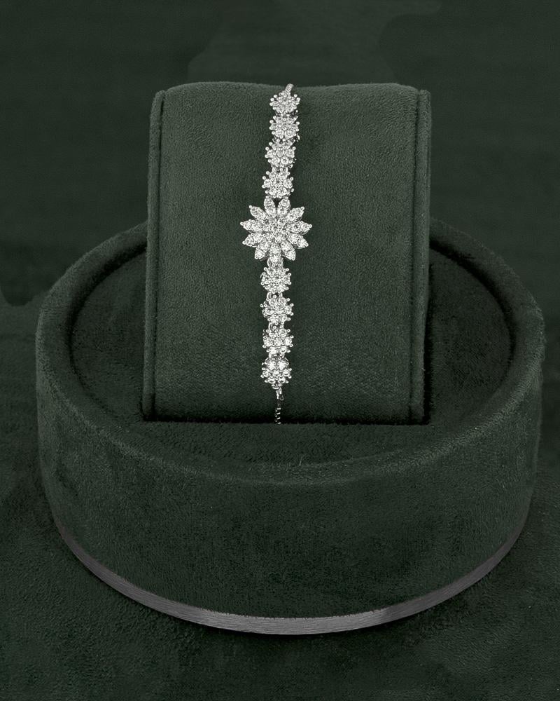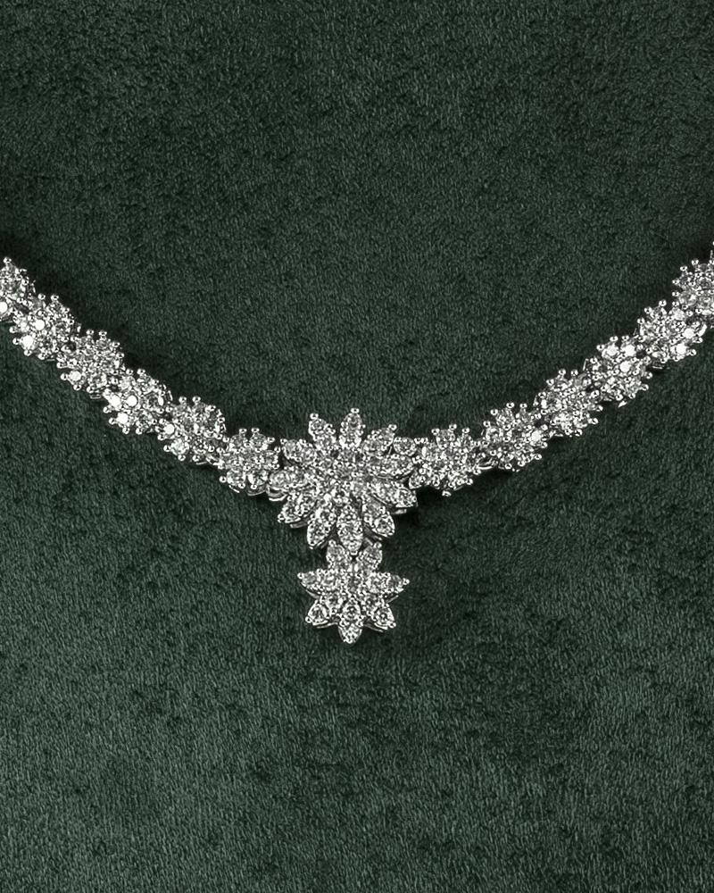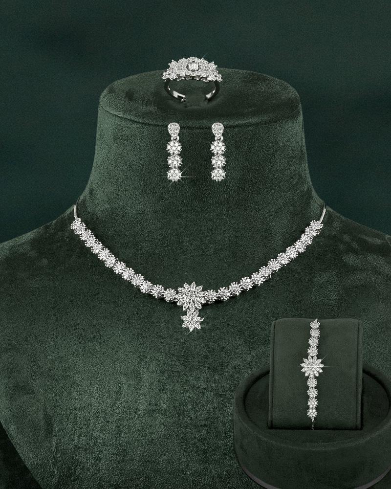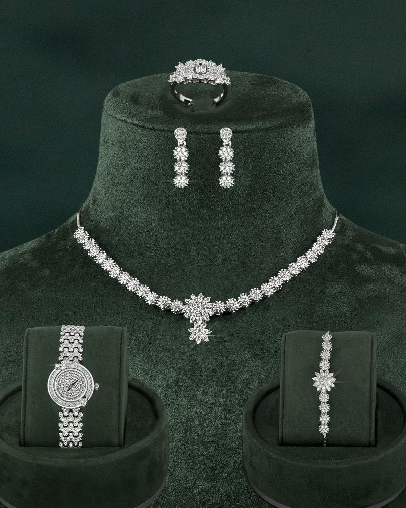 طقم أنيق يتكون من 5 قطع: قلادة، أسورة، خاتم، وأقراط، كلها مزينة بفصوص الزركون اللامعة التي تشبه بريق الألماس.