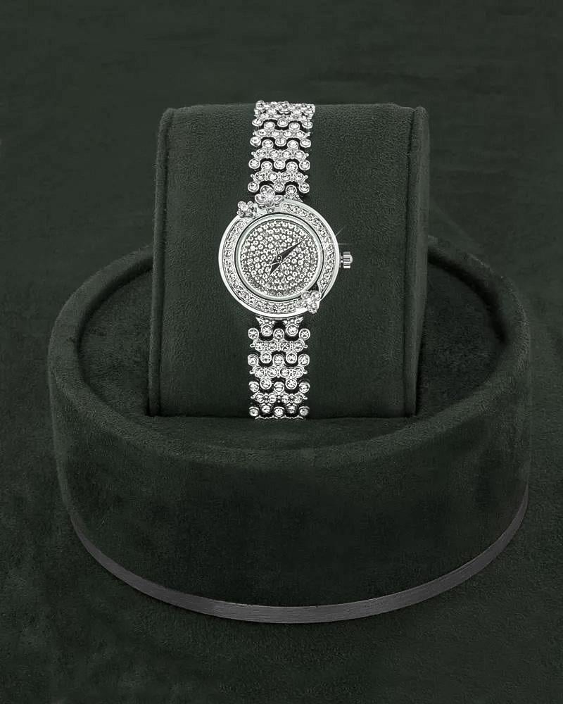 ساعة أصلية 100% مرصعة بفصوص الزركون، تجمع بين الدقة والأناقة.