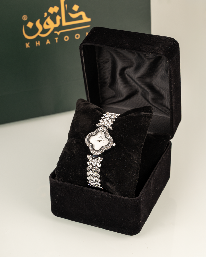 راحة، فخامة، جودة. ساعة فضية ناعمة توفّر لك كل ما تحتاجينه من دقة، وتحمل لكِ في كل لمعة وعداً بالأناقة.