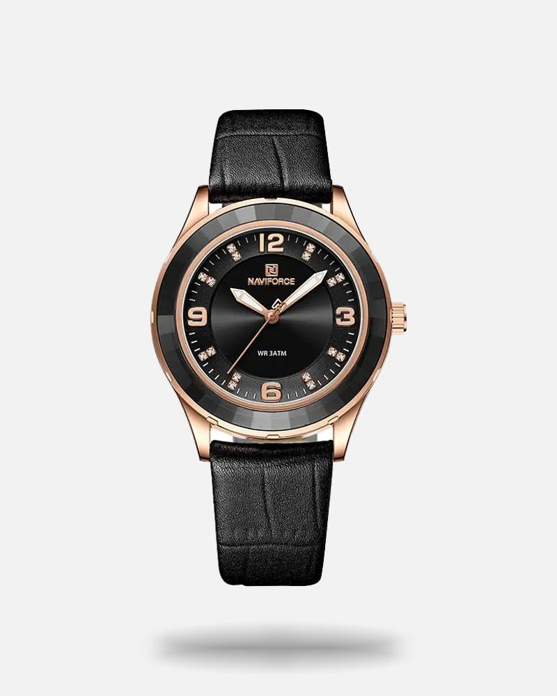 السوار الجلدي الأسود يوفر مظهرًا جذابًا ومريحًا، مثالي للارتداء اليومي أو في المناسبات الخاصة. مع مقاومتها للماء ومينائها الواضح، تعد هذه الساعة الخيار المثالي لكل امرأة تقدر الجودة والفخامة.