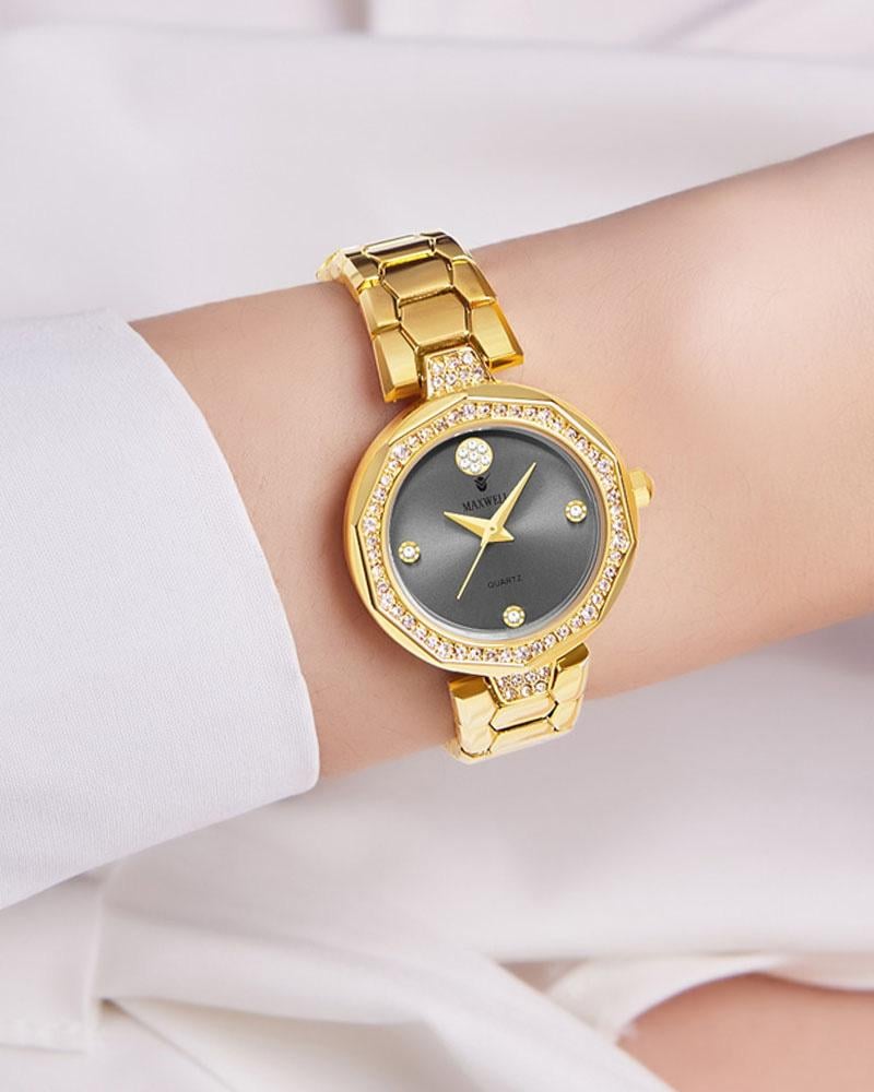 ساعة يد ذهبية للنساء بإطار مزخرف بالزركون ومينا رمادي