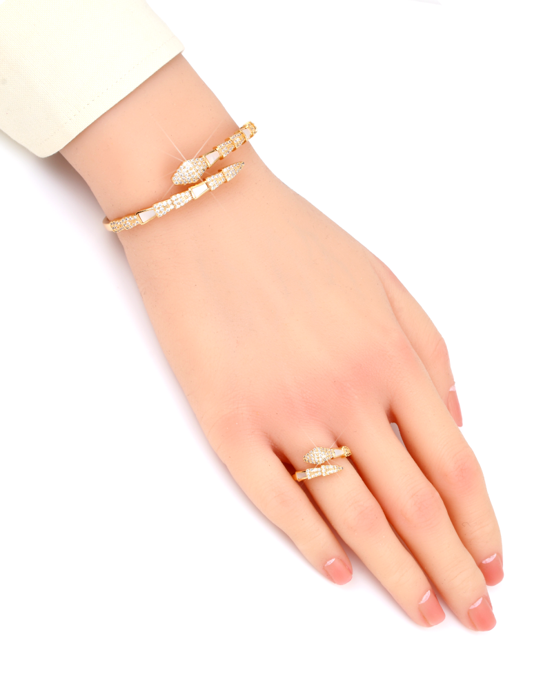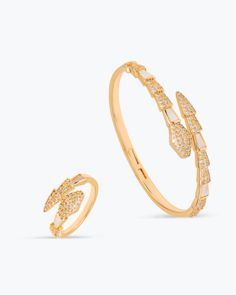 كل امرأة تستحق قطعة تعبّر عن جمالها ببساطة وفخامة. طقم الإسوارة والخاتم المذهل سيمنحكِ لمسة ذهبية تنطق بالأنوثة، وتجعلكِ تتألقين في يومكِ العادي كما في مناسباتكِ الخاصة.
