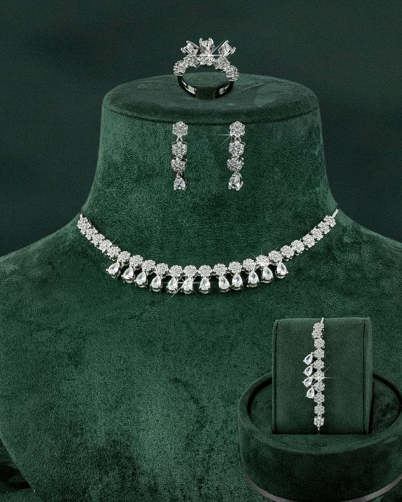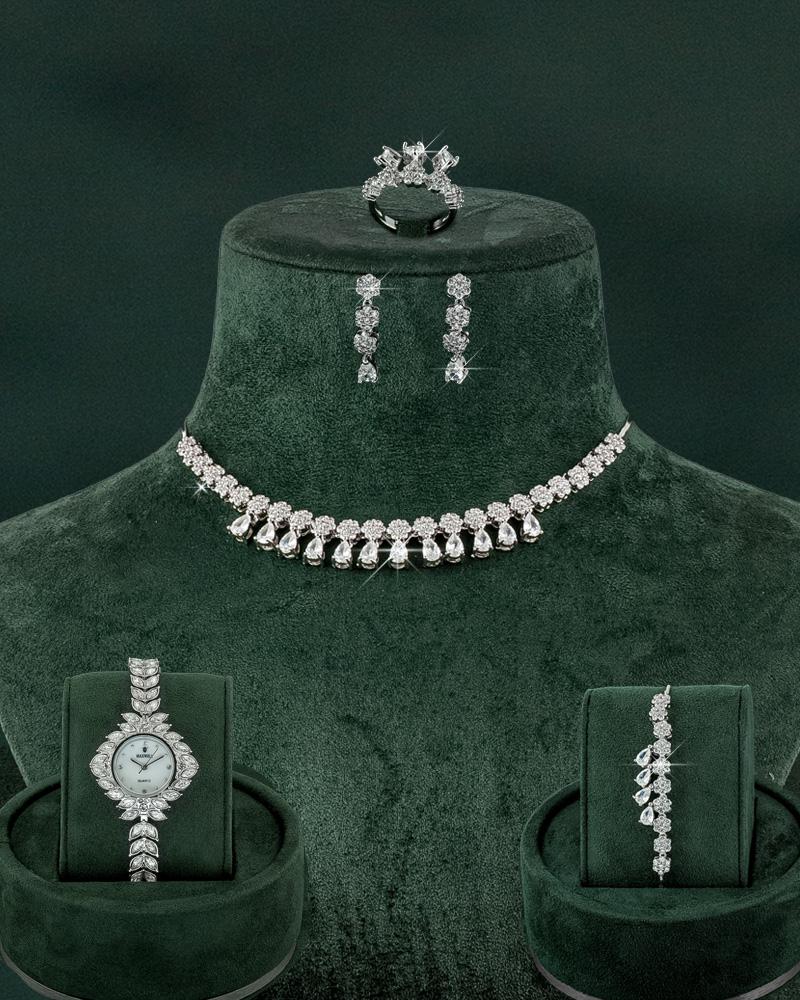 - 5 قطع تشمل قلادة، إسوارة، خاتم، وأقراط مرصعة بالزركون.